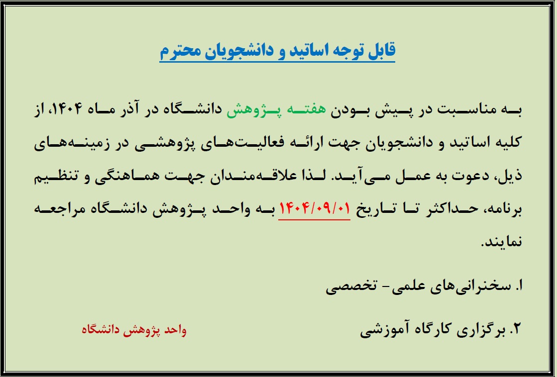 ۱۴۰۴/۸/۱۹ - اطلاعیه در مورد هفته پژوهش دانشگاه در آذرماه ۱۴۰۴